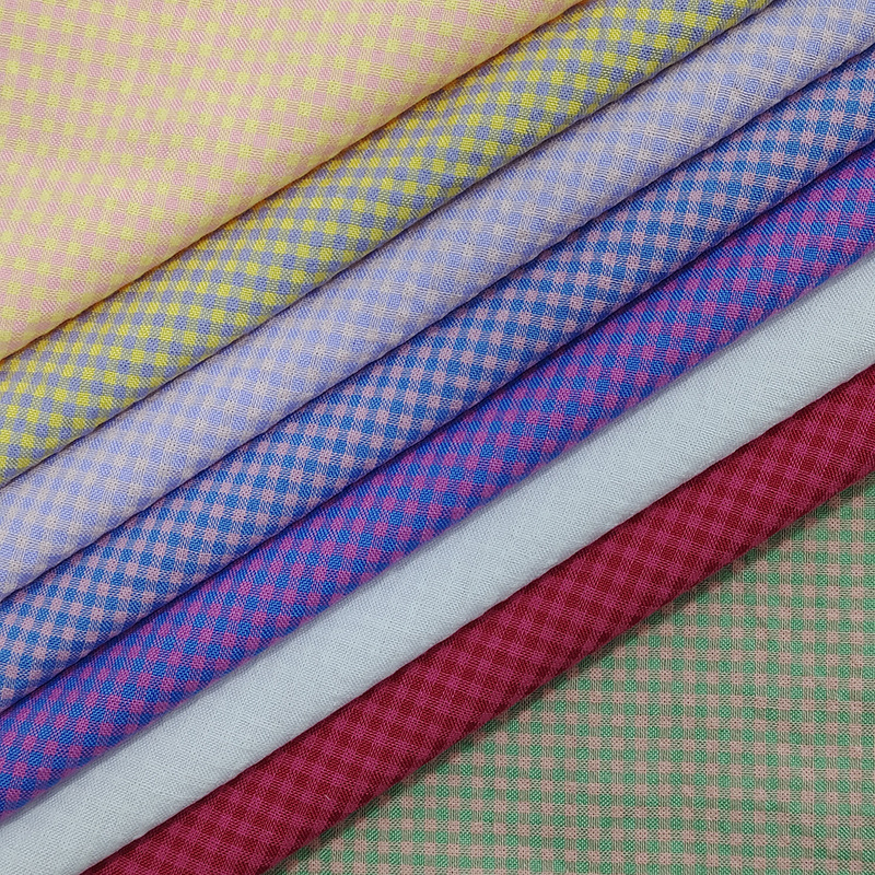 メーカーの現物ポリエステル綿の小さい格子の色の布地の春夏のファッションの婦人服のワンピースのシャツの布地は卸売りします。