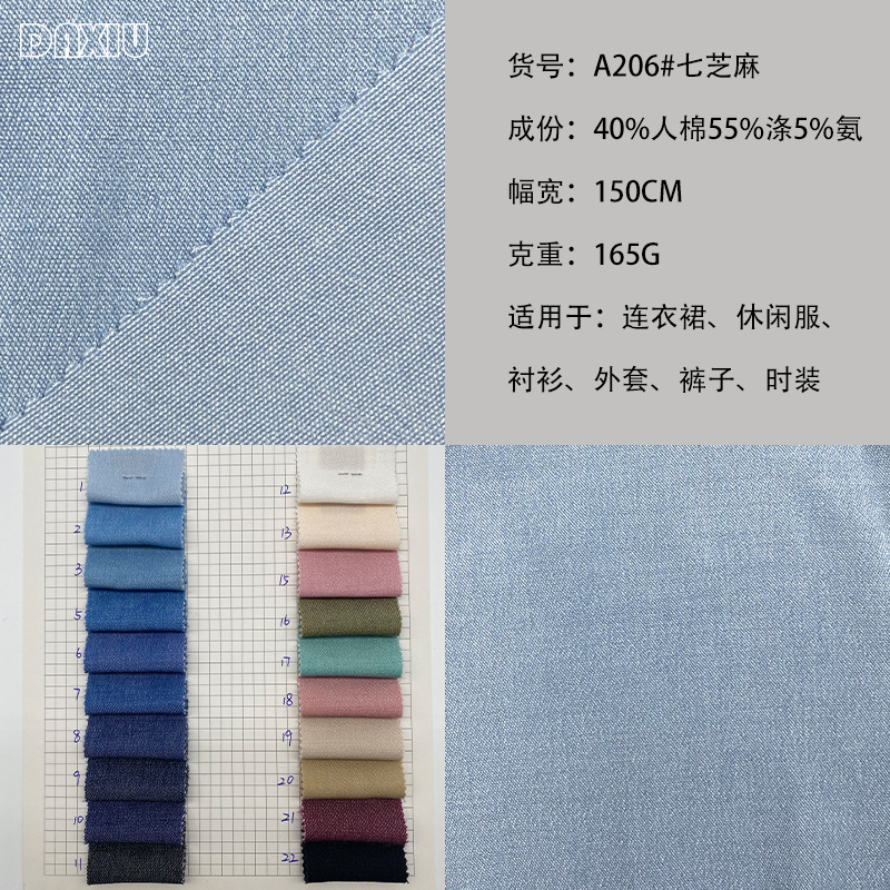 スポット卸売セブンゴマ模造デニムストレッチ生地ポリエステル綿デニム弾性シャツドレスパンツ生地