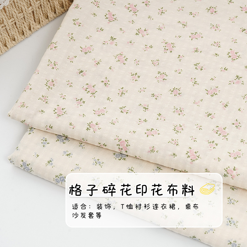 格子柄の花柄生地 春夏の質感のあるプリーツ加工のクレープ生地 シワ加工の生地 ワンピース 衣料品 プリント生地