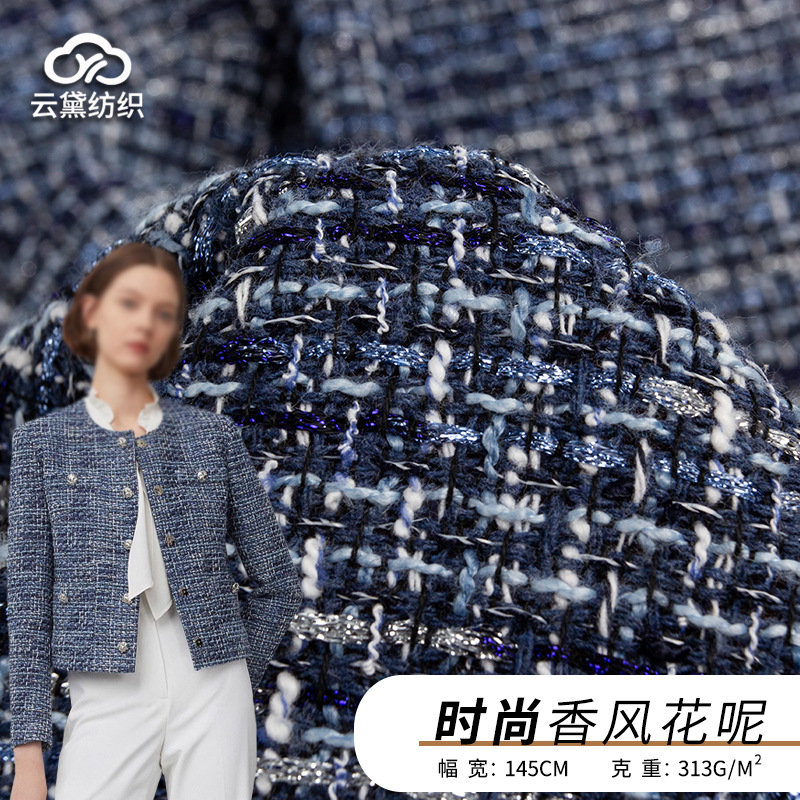 新商品の青いポリエステル綿の混紡の気質の秋冬の名媛の明るい糸は小さい香の風の生地のコートの上着の粗い花を編みます。