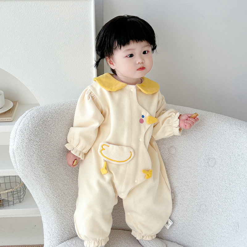 外国貿易の女の子の子供の秋冬のガードルの小さい黄色のアヒルの帽子の長い服の0-1歳の赤ちゃんの蝶結びのかわいい厚い連体の服