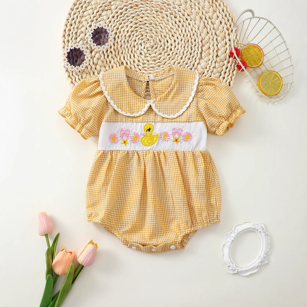 黄色の格子刺繍の小さい黄色のアヒルの服