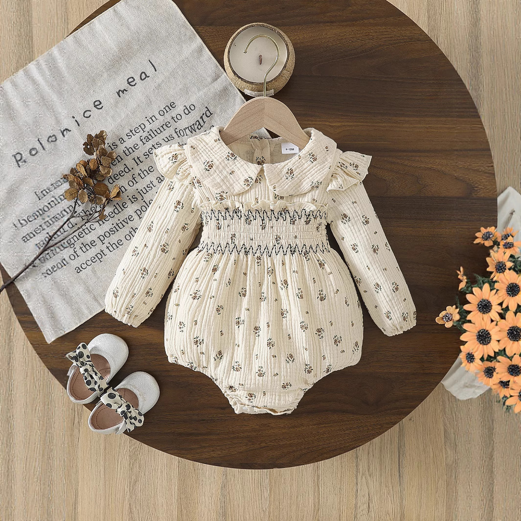 クロスボーダー甘いオフホワイトの小花柄刺繍人形襟長袖ロンパースソフトで通気性のあるベビー三角ロンパース