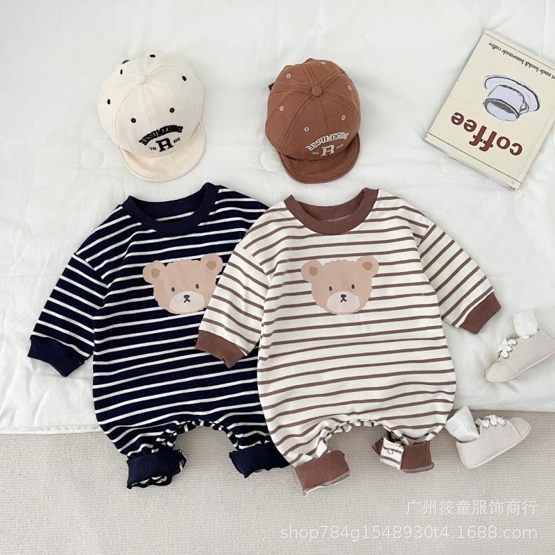 Ins韓国版乳幼児服男女赤ちゃんストライプ熊可愛いハ衣新入生百日長袖連体服
