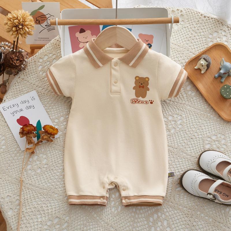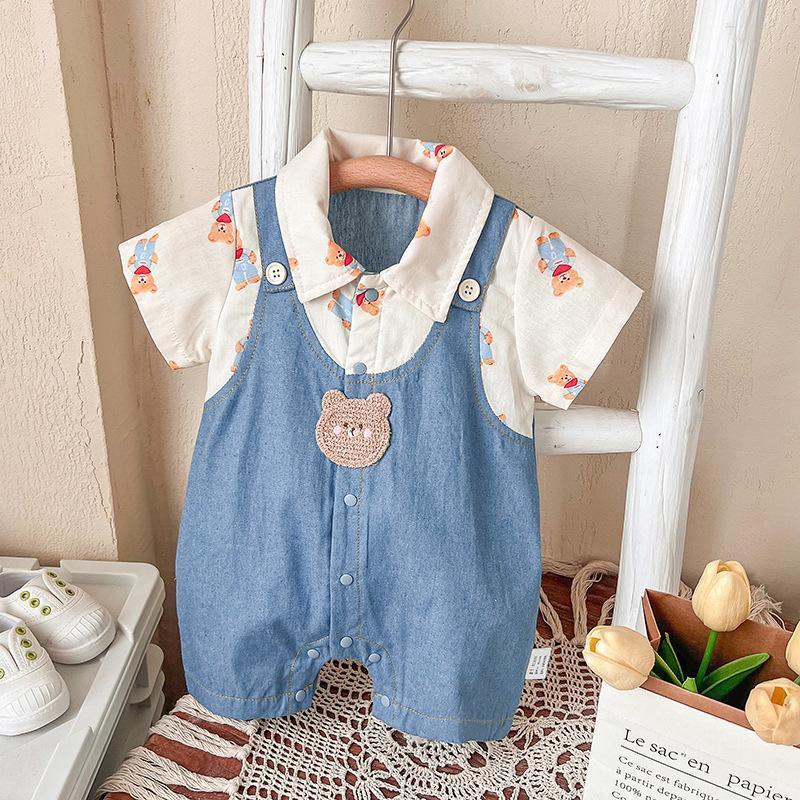 【4339人のお気に入り】男の子の赤ちゃん半袖ジャンプスーツ、かわいいラペルクマの夏服、幼児と幼児向けの超かわいい