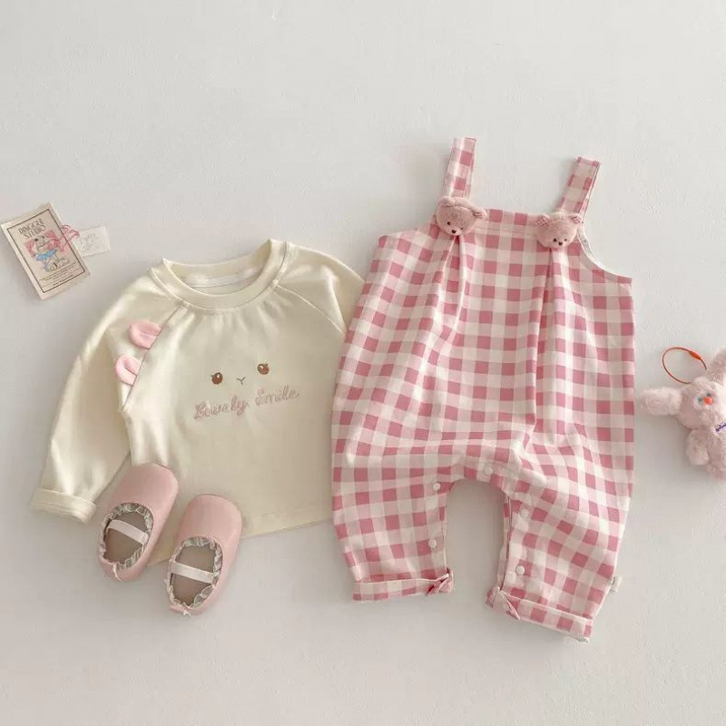 女の赤ちゃん超かわいいオーバーオール 2025 春スタイル子供服ベビーチェック柄クマジャンプスーツ新生児春服