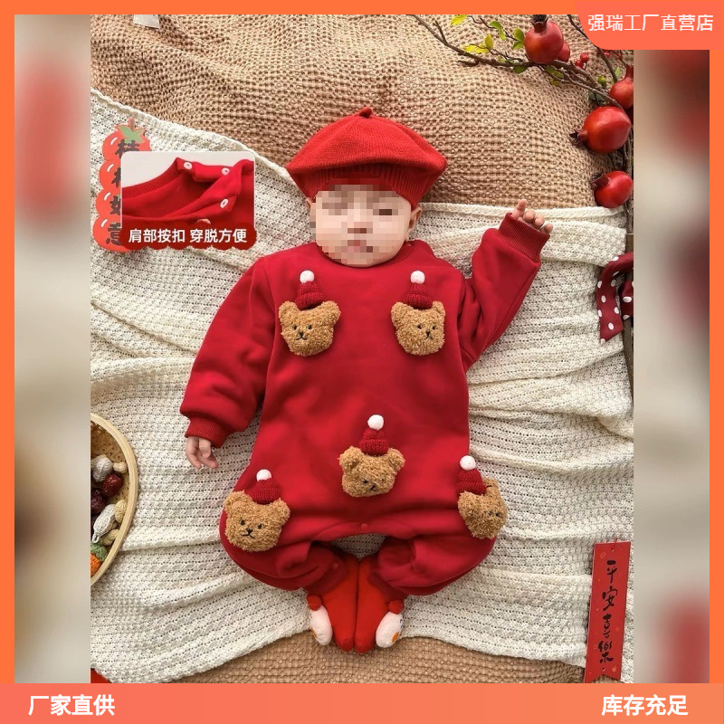 赤ちゃんの新年服の連体服の二重ベルベットは、ベアーが服を着ている赤ちゃんの赤いお祝いの新年服の流れを厚くします