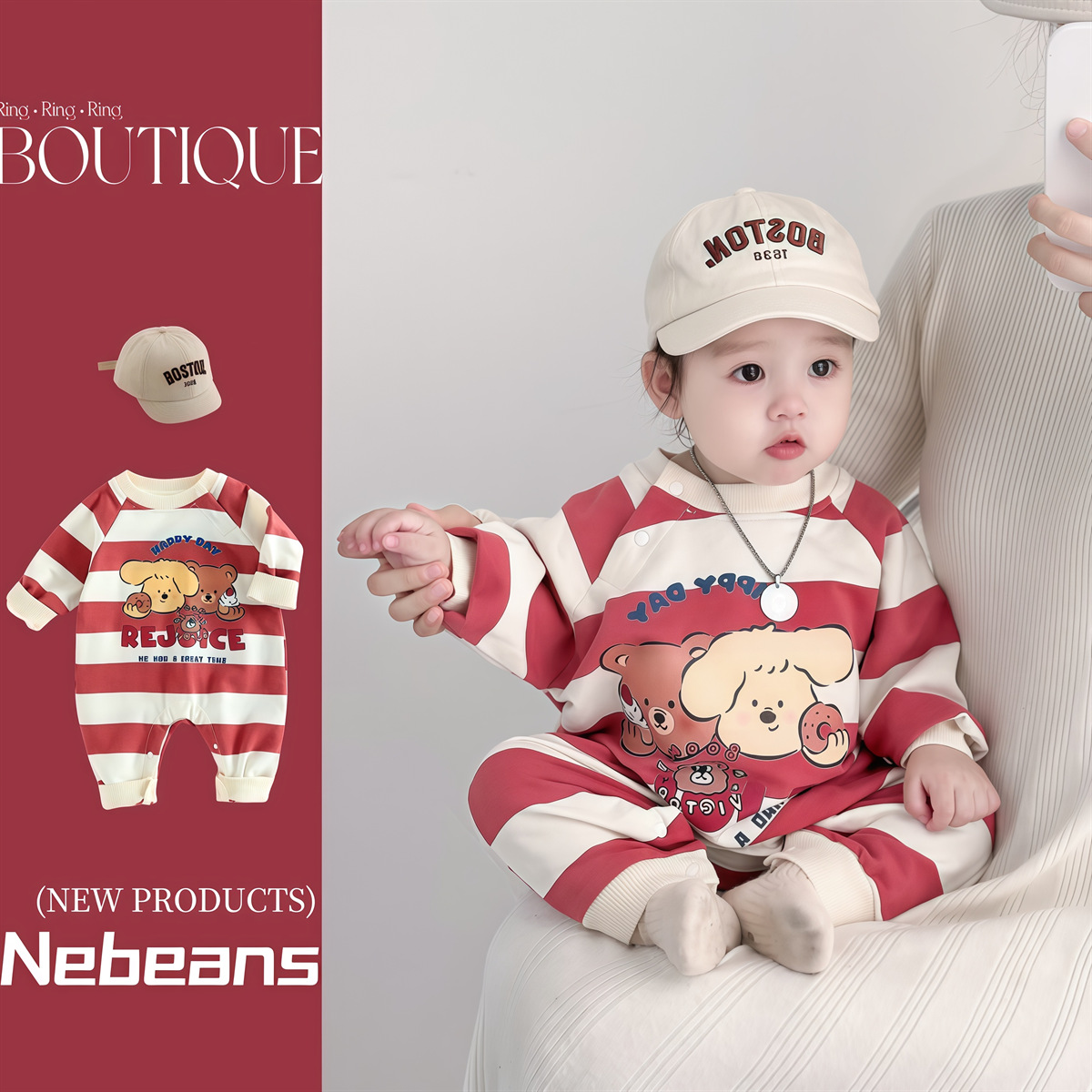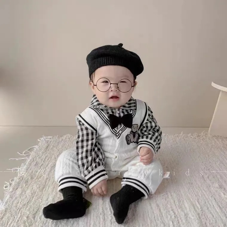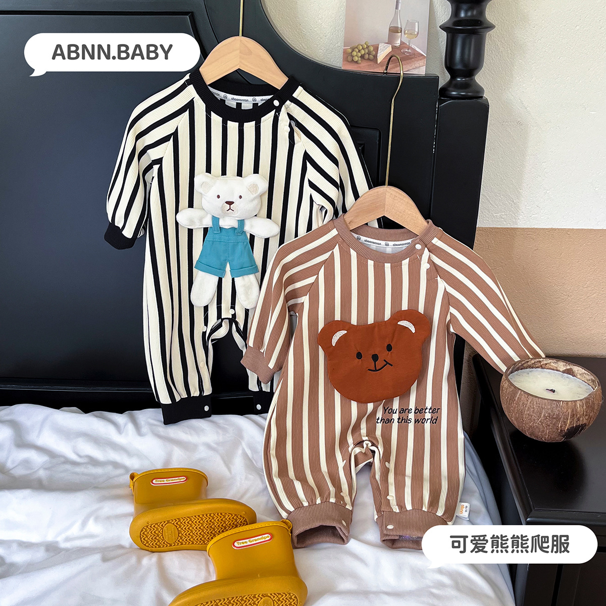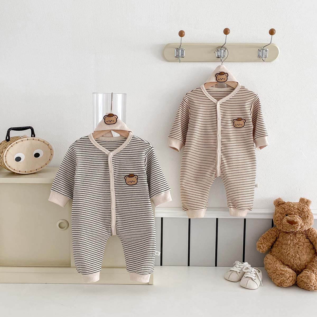 幼児ジャンプスーツ、春秋韓国風クマストライプ服、新生児お出かけハイハイ服、男の子子供服、在庫あり