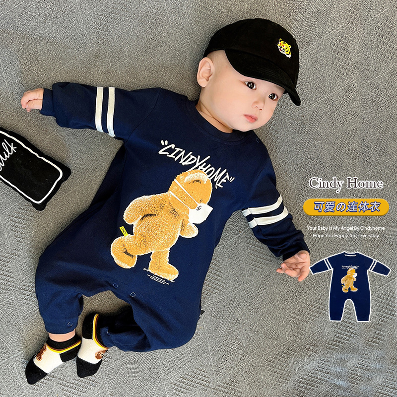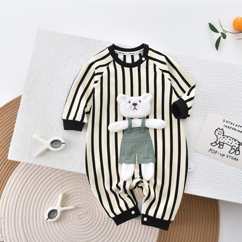 ベビー春服漫画風クマ柄ロンパース新生児ジャンプスーツ春秋ベビーストライプ綿素材外着