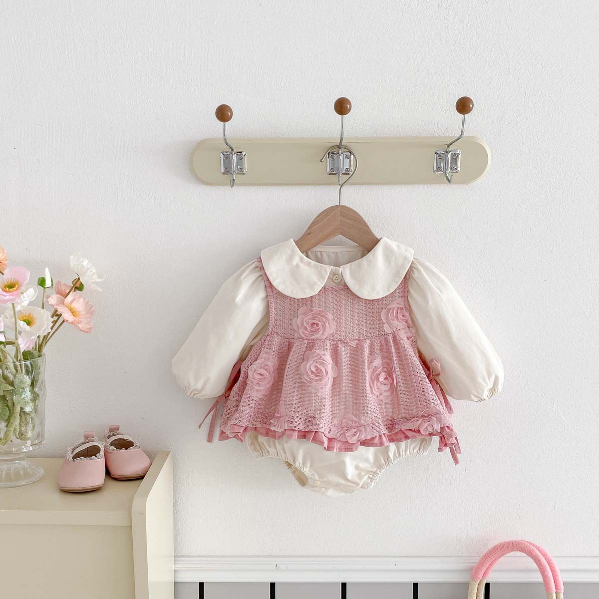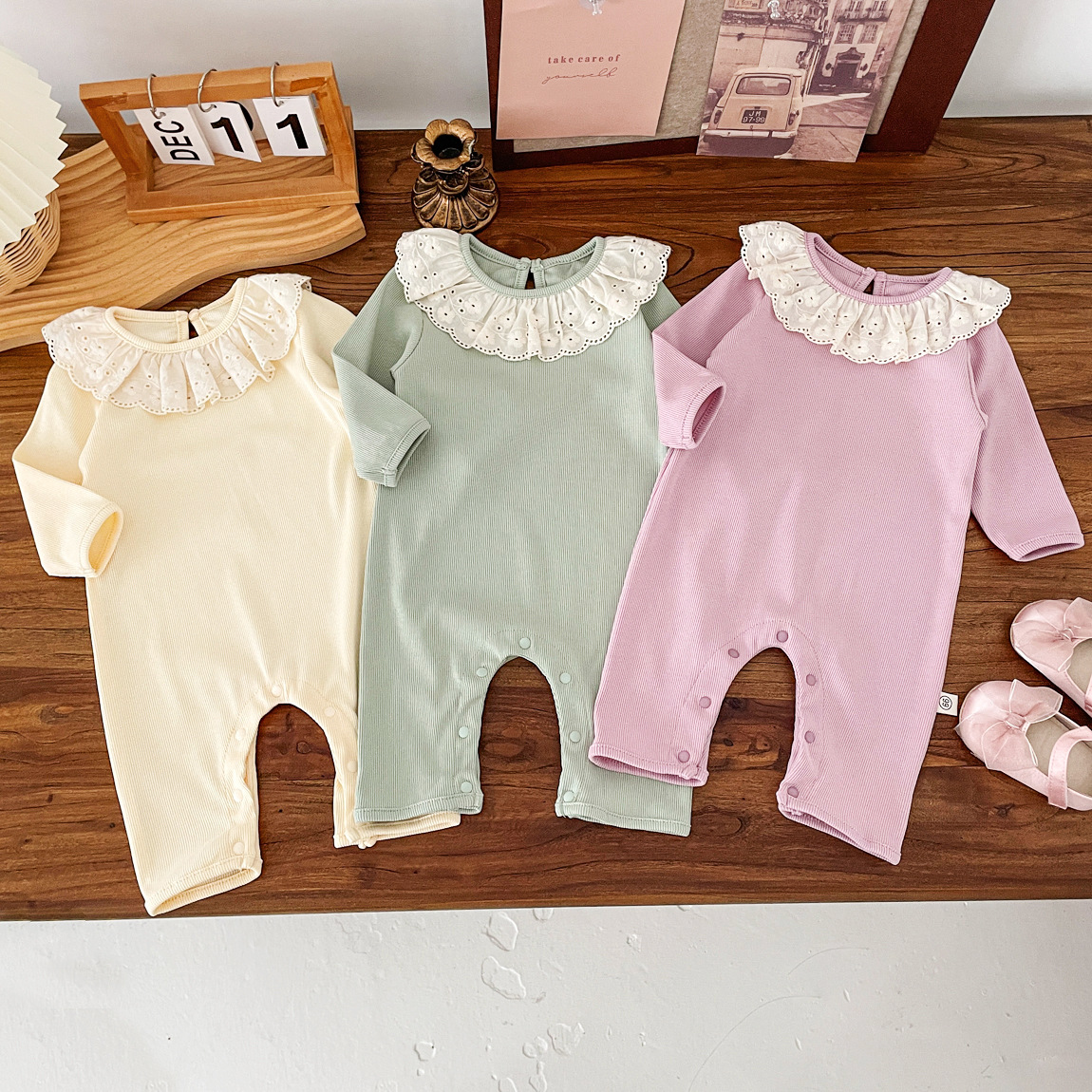 2025秋の新作女の子レースドールカラー長袖ラウンドネックワンピース新生児満月写真撮影用
