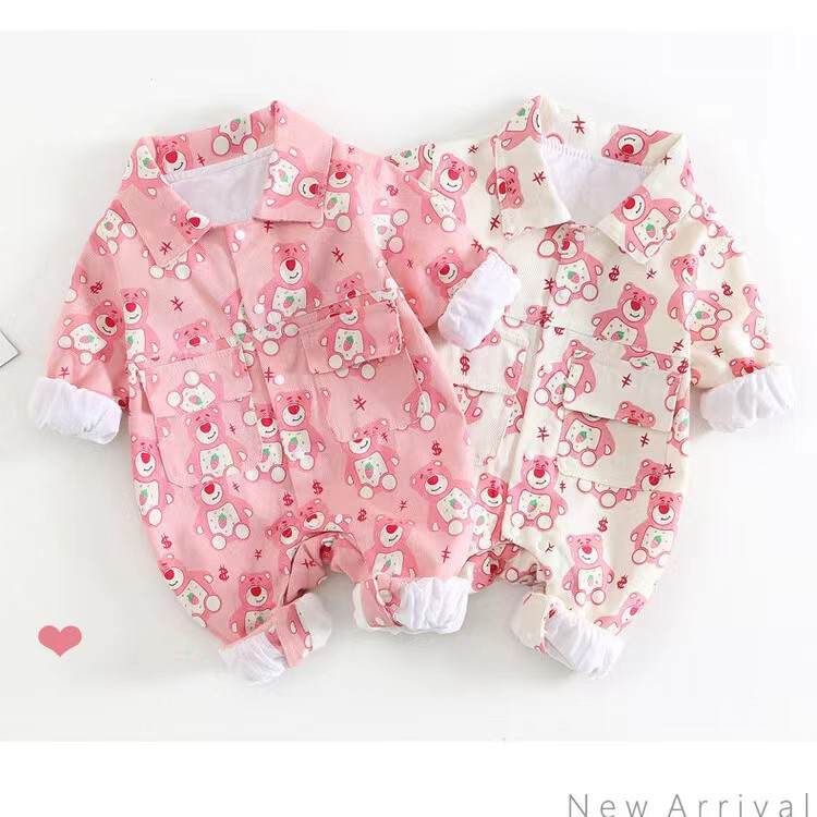 春と秋の幼児長袖ジャンプスーツ、男性と女性用、二重層フルプリントイチゴクマジャンプスーツ、多用途