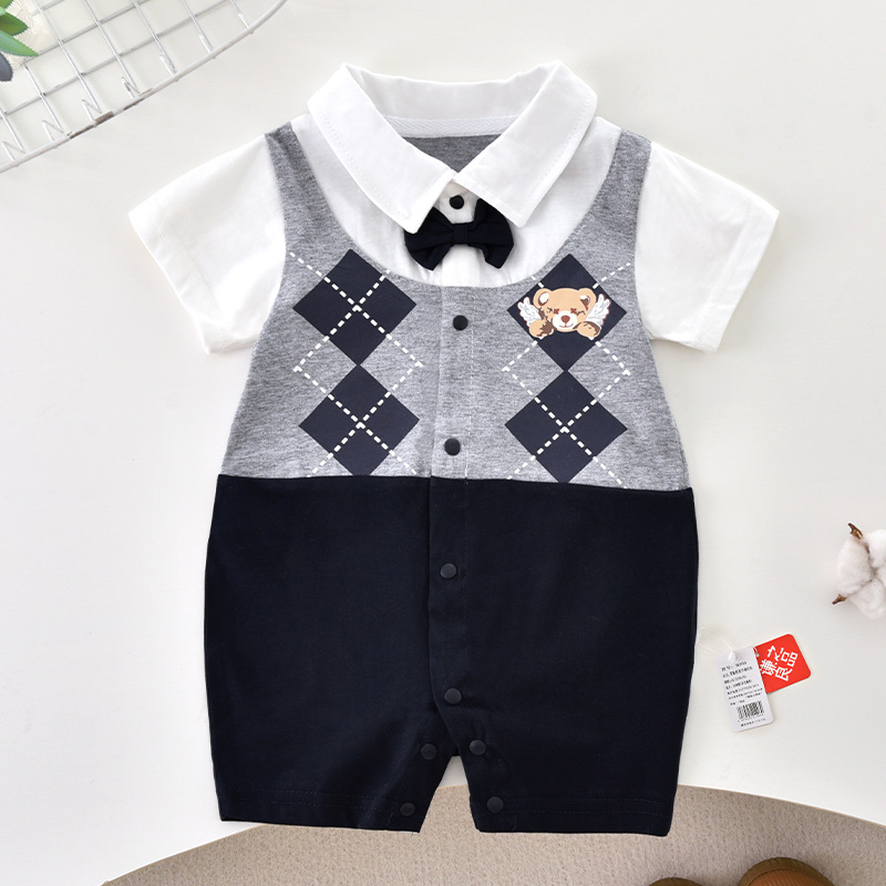 赤ちゃんの夏服の薄い格好いい服の新生児の赤ちゃんの夏の学院の風の菱格の熊の半袖の連体の服の潮