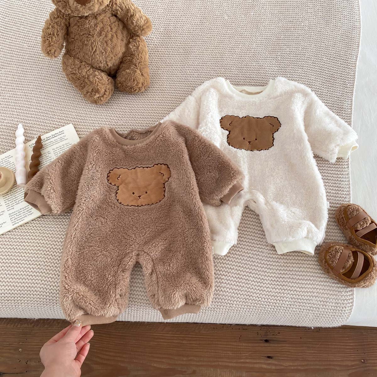 ベビーロンパース秋冬服ベルベット保温ベアー模様帽子付きジッパー上着羊小毛外着