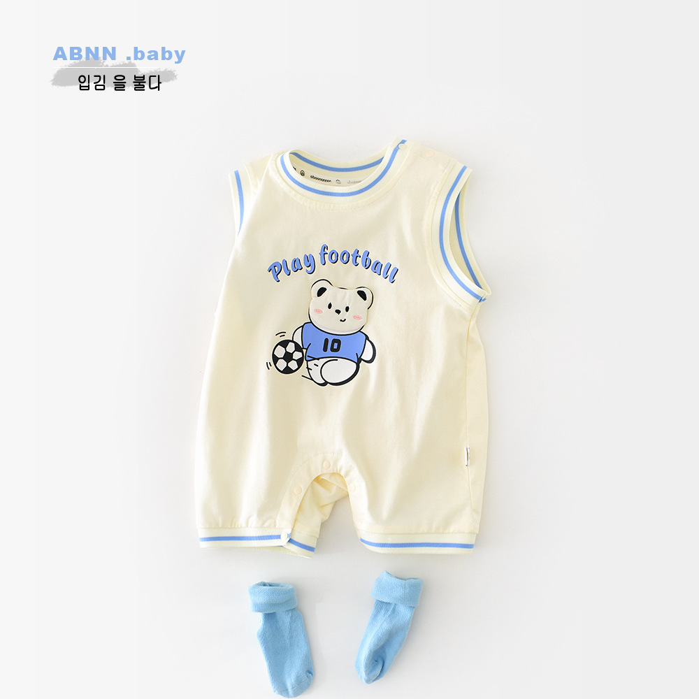 越己2025夏の子供漫画熊はボールを蹴って子供のアルファベットの袖なしのお尻の服を着ます52016
