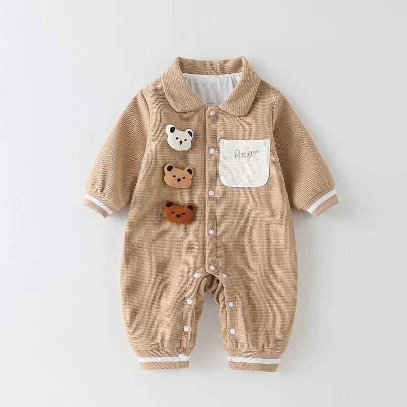ベビーロンパース 秋 長袖ロンパース 男女兼用 赤ちゃん漫画風クマ柄 大きなポケット付きロンパース 新生児 百日祝い服