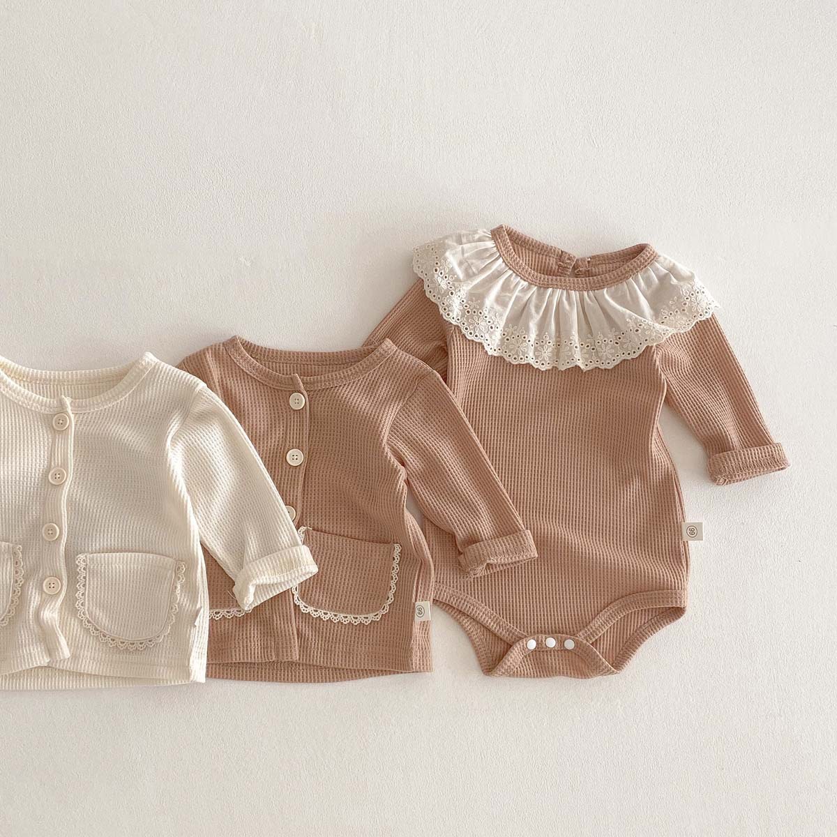 2025春の新商品の女の赤ちゃんのワッフルの子供の襟の連体の服の赤ちゃんの韓国版の純色のおならの三角の服