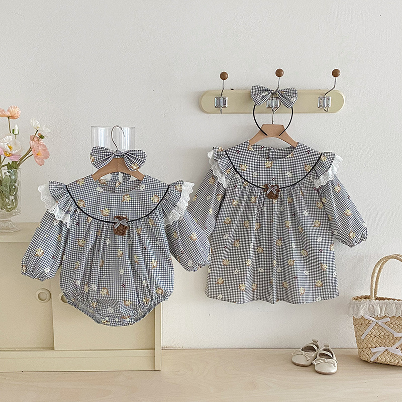 25 秋のベビー服長袖ベビーレースベビー服女の子新しいクマドレスチェック柄姉妹衣装