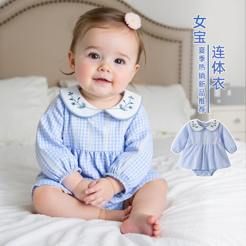秋物ロンパースA級2025年新作幼児女児用ワンピーススカート、ドールカラー刺繍入りチェック柄ロンパース