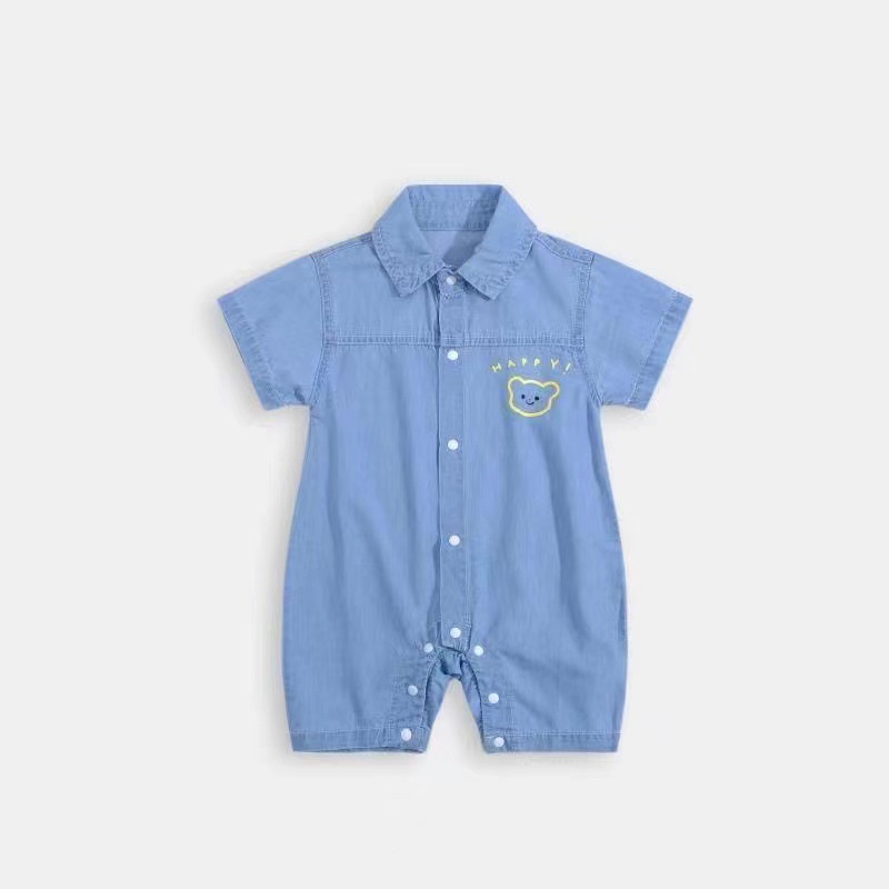 超萌男の赤ちゃんの夏服の半袖のデニムのワンピースの服の百日の赤ちゃんの服の夏の熊の半袖の外で服を着ます。