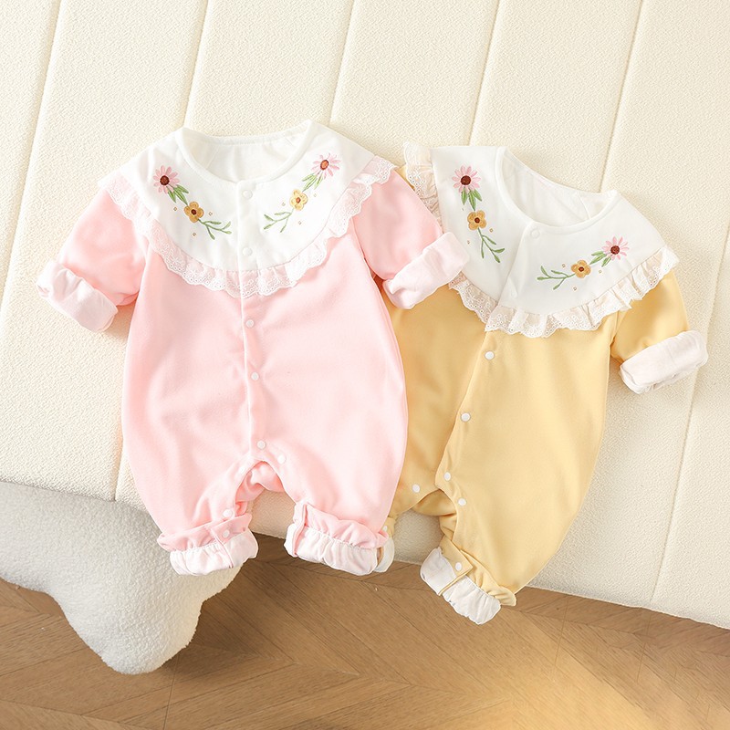 2024春秋女性の赤ちゃんの連体服はシンプルで甘い子供の襟のお尻の服の赤ちゃんの純色の長袖の百日の哈衣です。