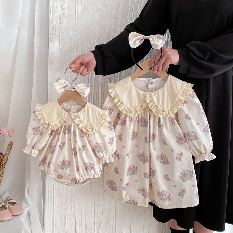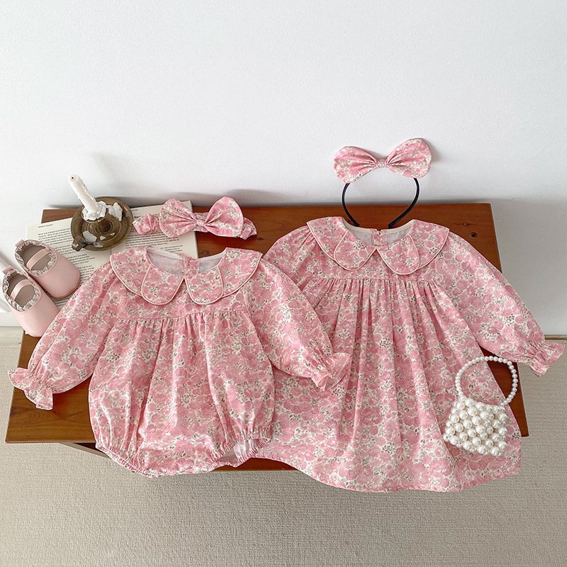 韓国風子供服 2025 秋ベビー服花柄プリンセスロンパース子供人形襟ドレス姉妹衣装