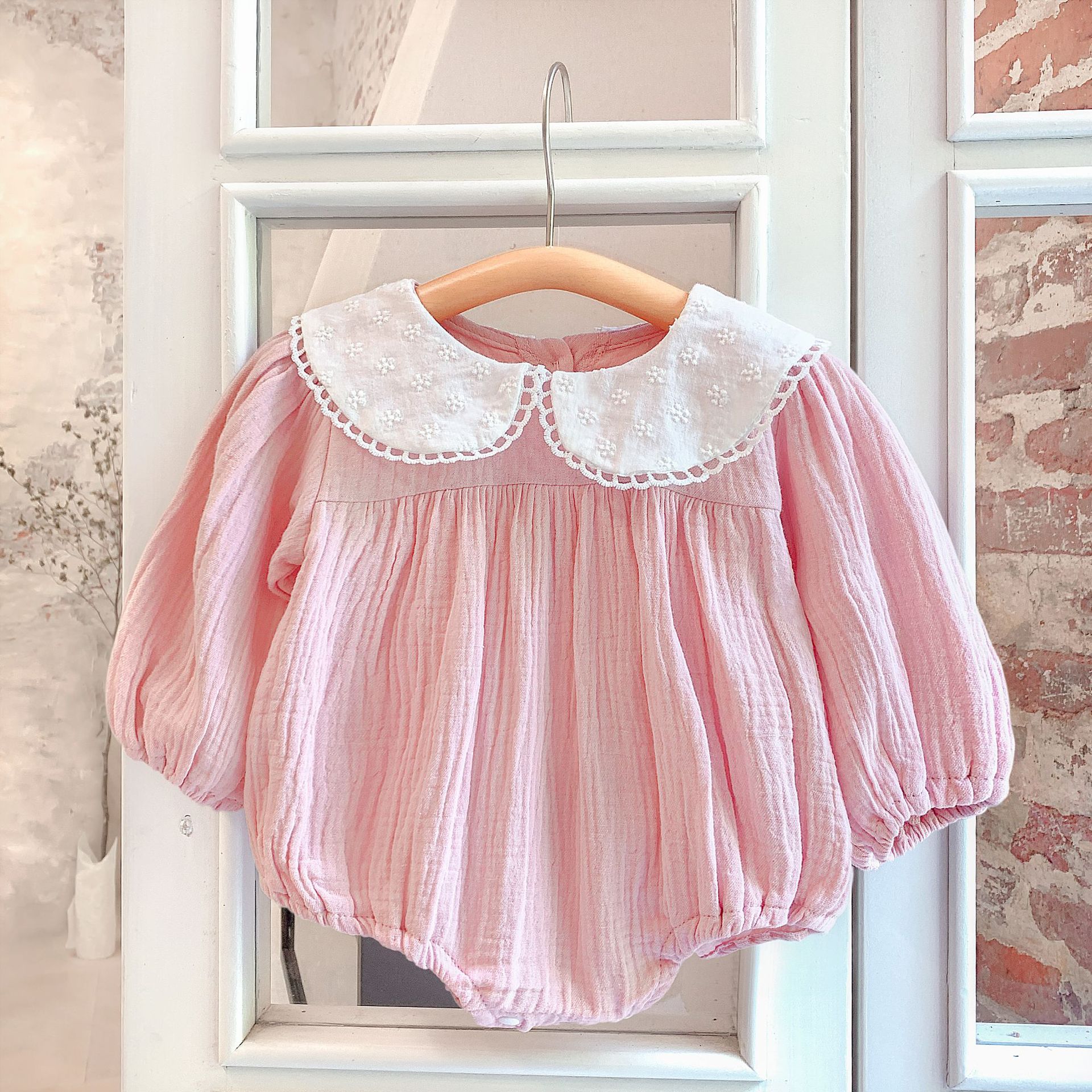 韓国版ins子供襟綿麻長袖のお尻の服春秋の金の連体の砕花の純色の女性の赤ちゃんは簡単に似合います。
