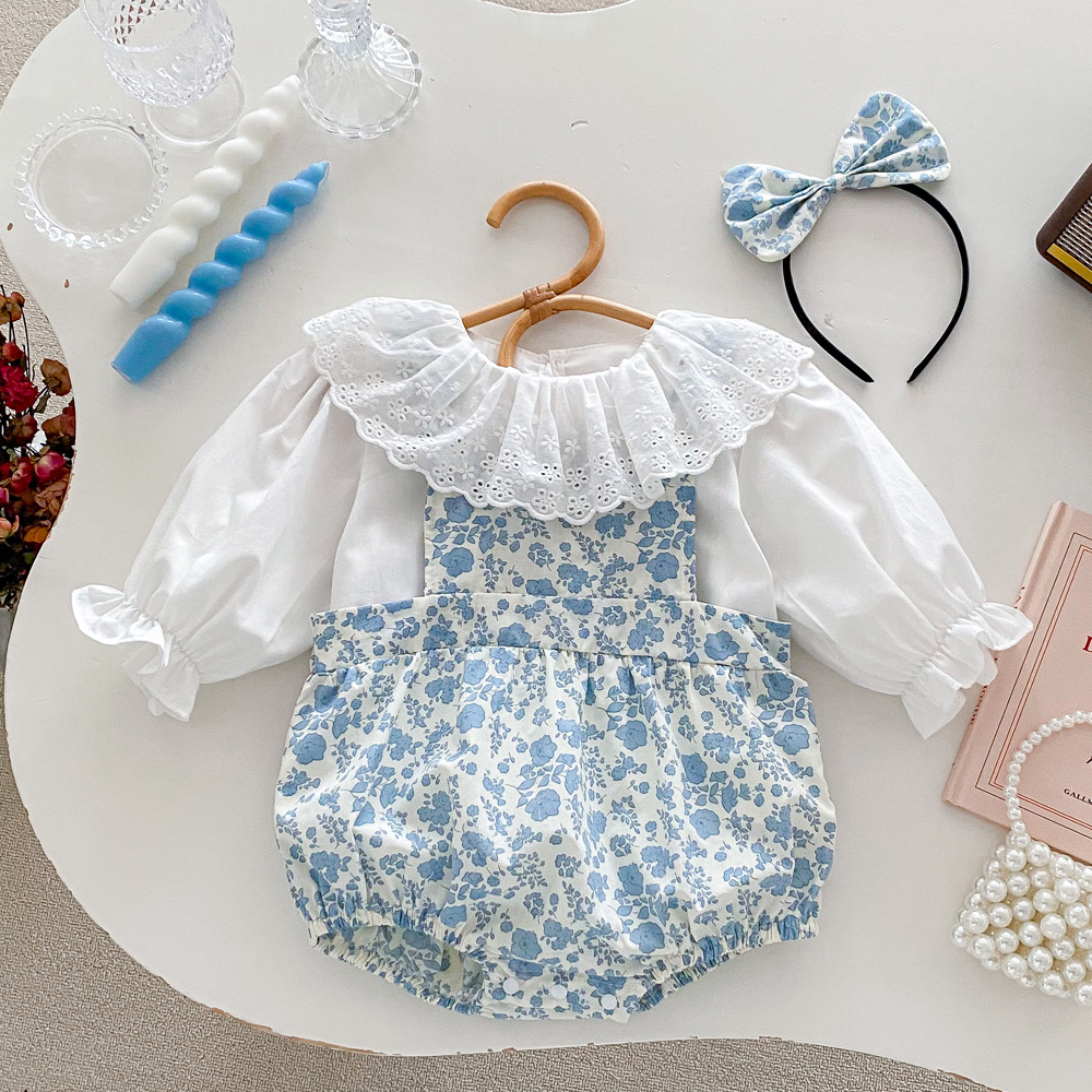 25 秋のベビー服女の子ベビードール襟レーストップ女の子花柄サスペンダーロンパース 2 点セット