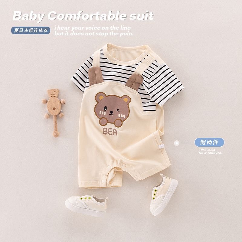 ベビー偽ツーピース半袖ジャンプスーツ、夏用薄手ベビーロンパース、新生児服、夏用ストライプベア