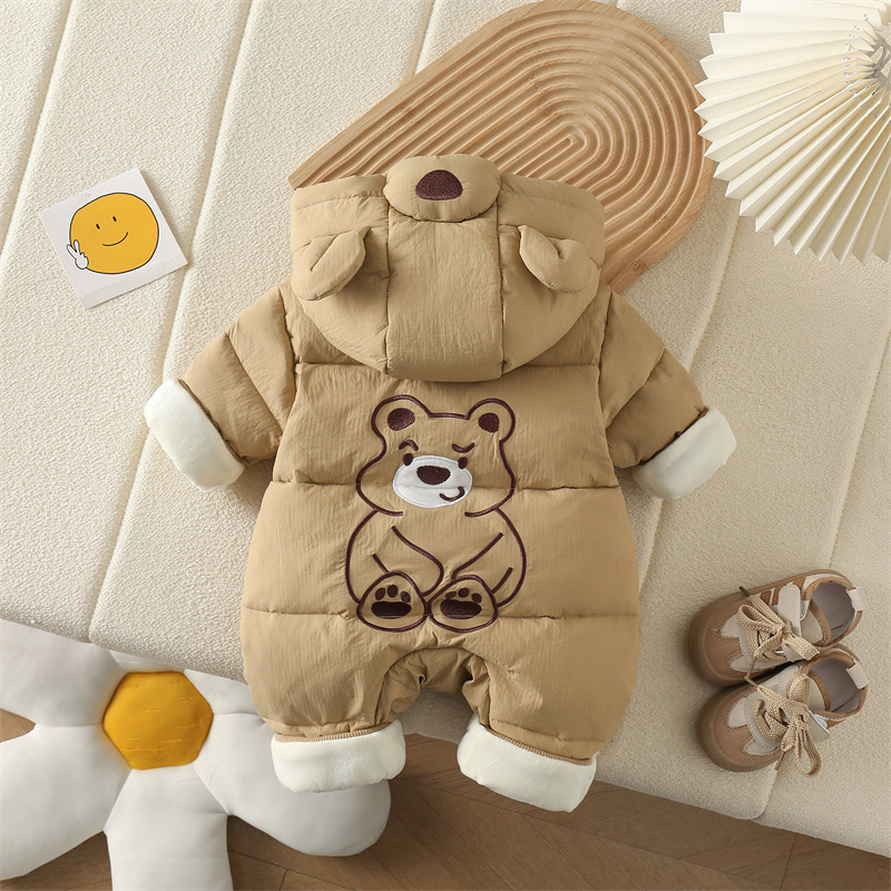 秋冬のカシミヤのファッションモデルの熊の乳幼児の連体服の男女の赤ちゃんの薄い綿の哈衣の新生児は外に出て服を登ります。
