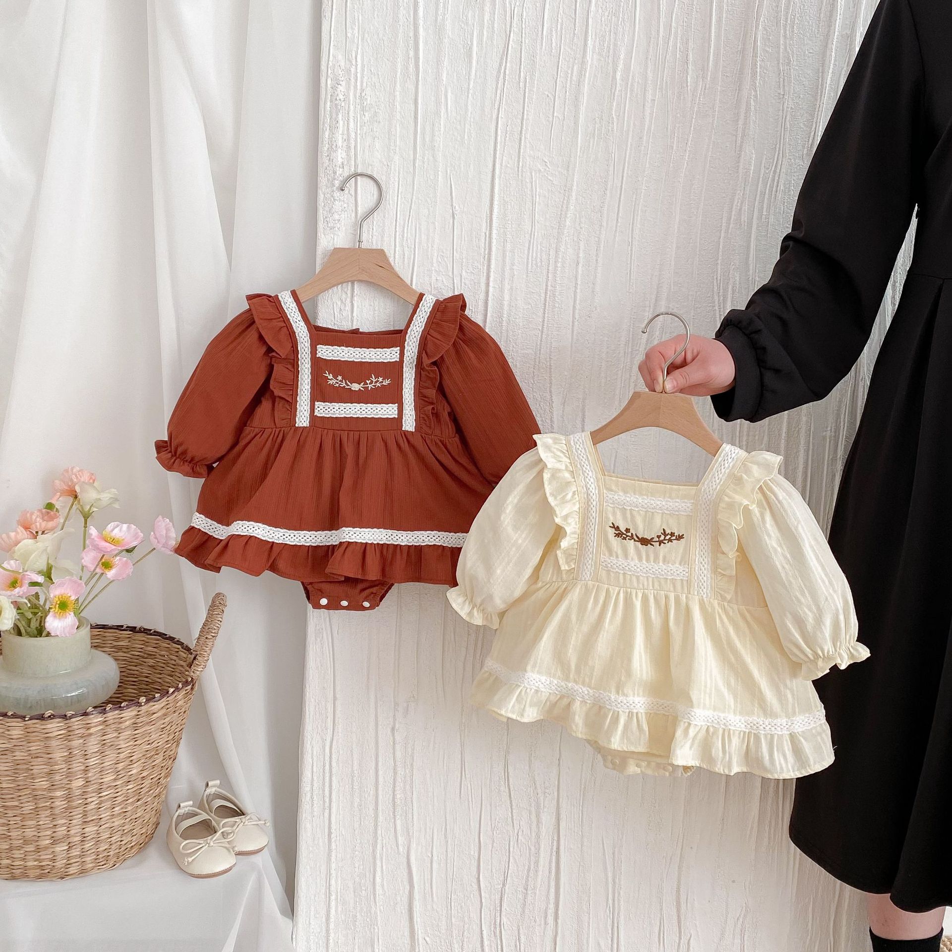 幼児服、女の赤ちゃんハイハイ服、花柄人形襟長袖ロンパース、ワンピース、お出かけ服、春秋スタイル