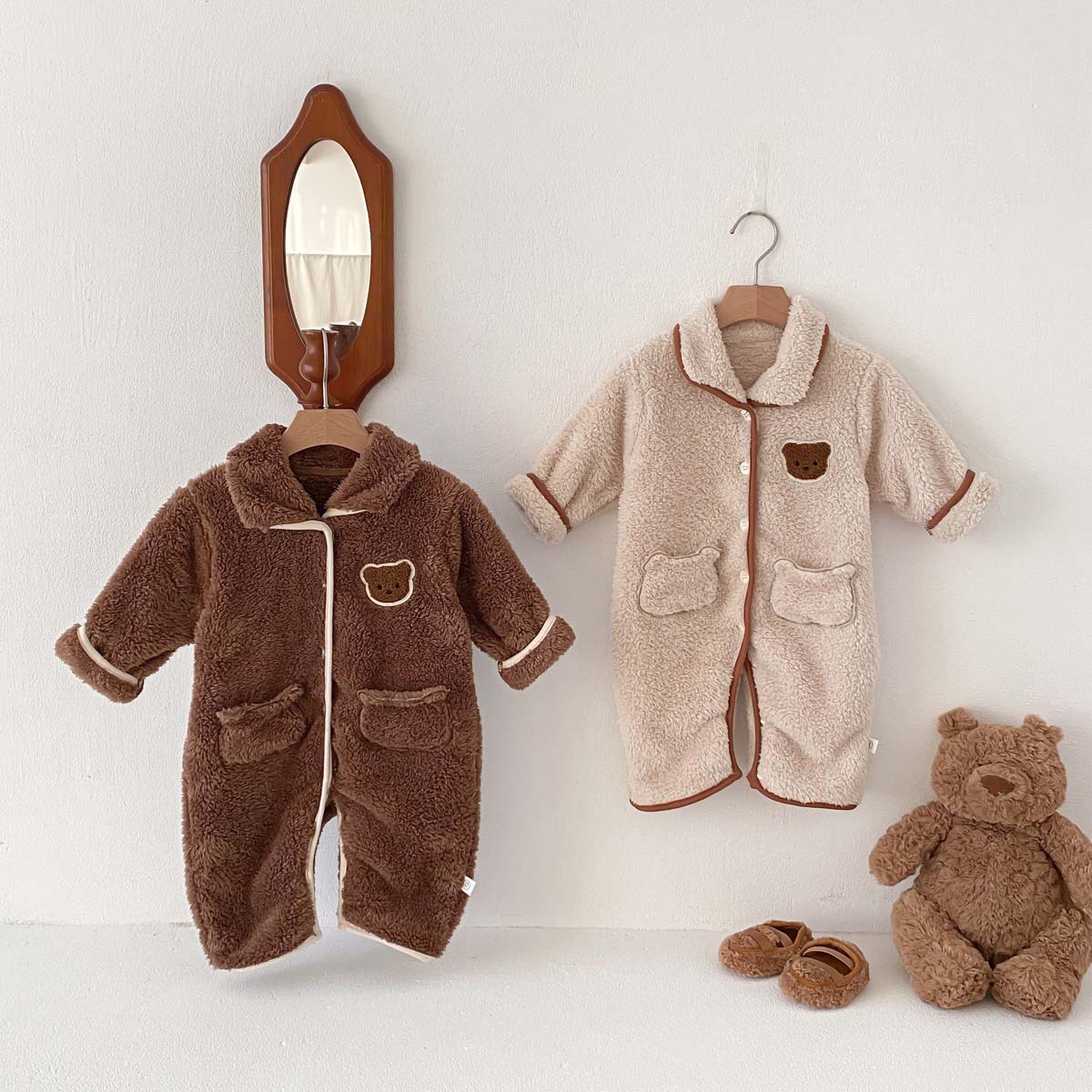Ins韓国版子供冬の連体服の熊の両面の毛の保温子供服のパジャマの赤ちゃんの男女の赤ちゃんは服を登ります。