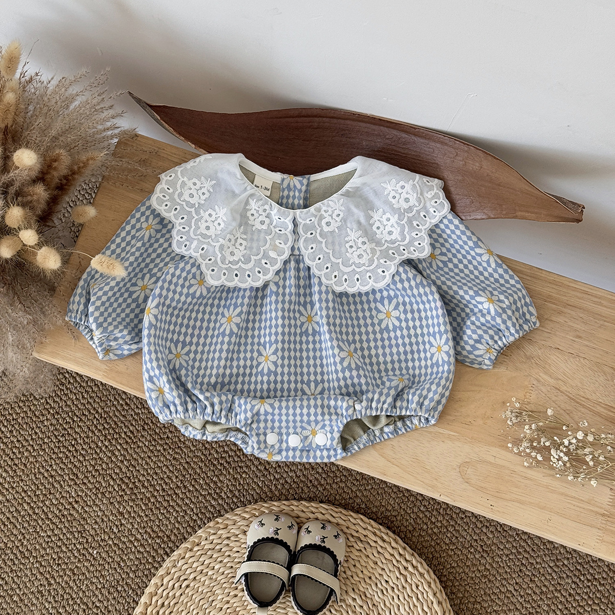 春と秋の韓国風幼児プリントジャンプスーツ女の赤ちゃんレースフリル襟人形襟三角長袖ローブ