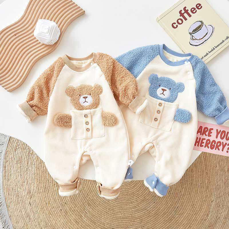 乳幼児用ワンピース冬服男の子用カジュアル長袖ベルベットアウター服ワッフル熊ヘッドキャップ綿ロンパース
