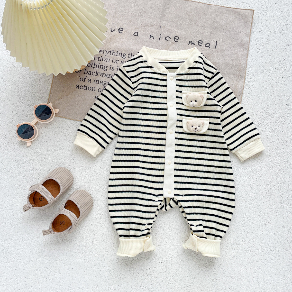 23赤ちゃんの韓国版秋冬のストライプの長袖の丸首の立体の熊の連体の服の春秋のタイプの男の子の赤ちゃんの洋気は服を登ります。