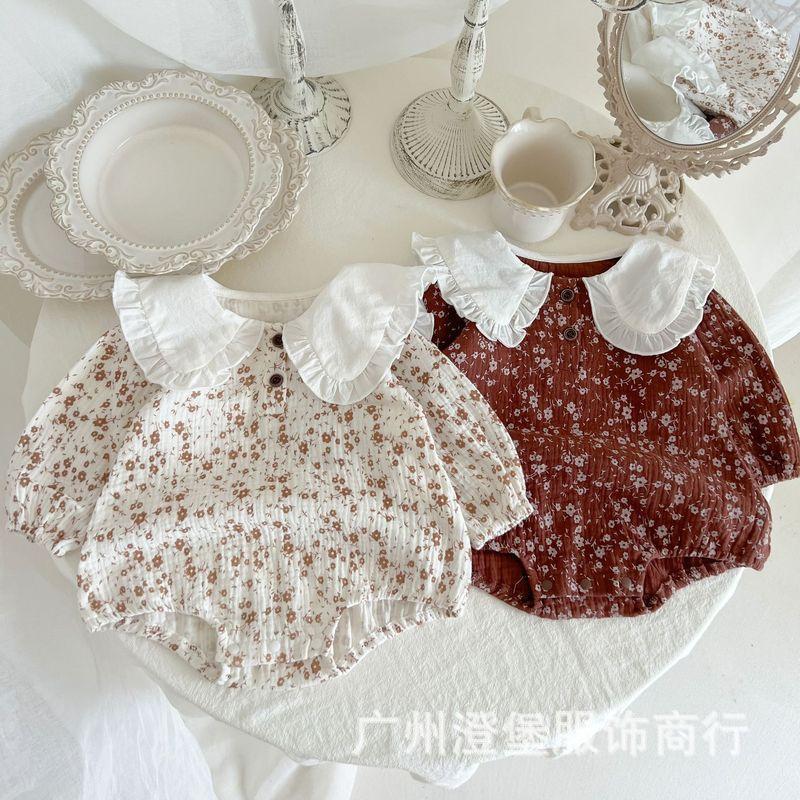 新型の女の子の赤ちゃんの連体の服の洋風の秋の服の綿の質の2層の子供の襟の砕けた花は女性の赤ちゃんのお尻の服を登ります。