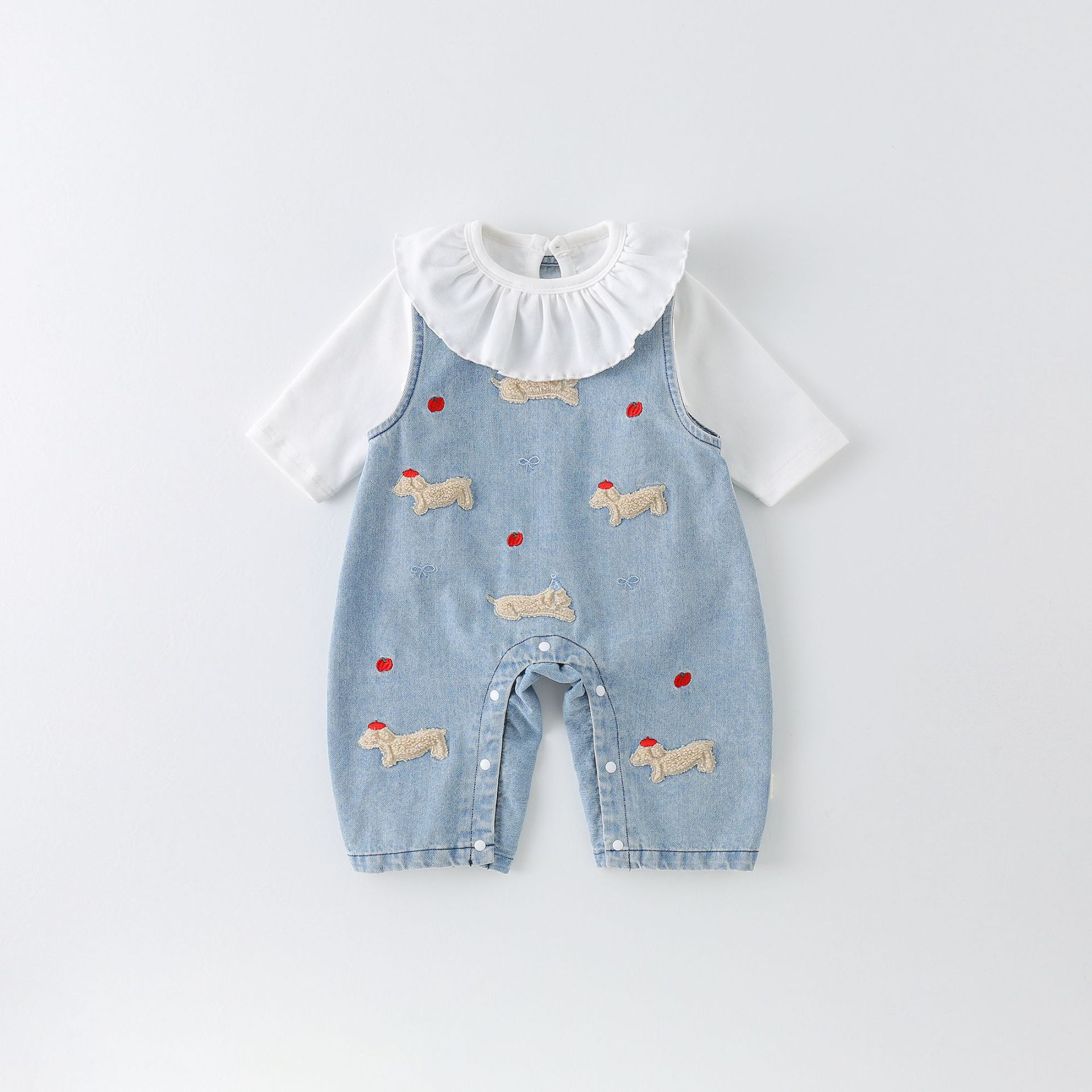 赤ちゃんの連体服春秋のデニムの熊の乳幼児は外に出ます。