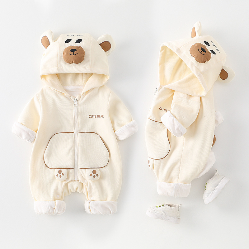 秋冬ベビージャンプスーツ、男女兼用暖かいおならカバー、かわいいクマのフード付きロンパース、新生児ロンパース