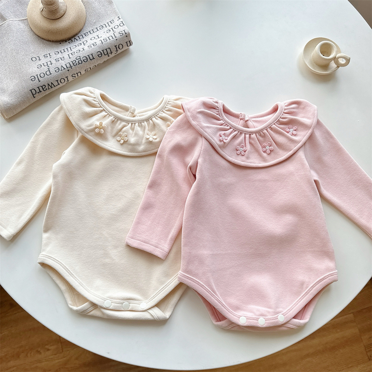 韓国版ins春の男女の子供の綿の肌の子供の襟の子供の襟の屁のジャンプスーツは赤ちゃんの長袖の服に登ります。