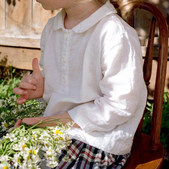 コットンとリネンのドールカラー子供用シャツ春と秋のフォレストスタイル9分袖白シャツ男性と女性用リネンラペルトップ