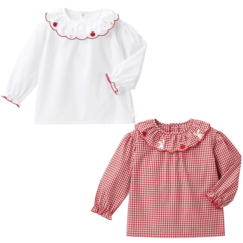 シャツの日本の女の子の漫画のウサギのリンゴの刺繍の子供の襟の長袖のシャツの底のシャツは代行します。