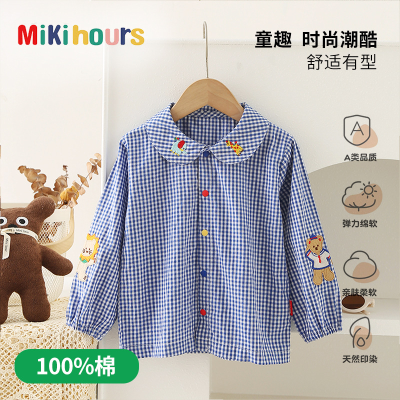 ミキ子供服春と秋のラペルシャツ新しい子供の漫画クマ刺繍人形襟チェック柄長袖シャツ
