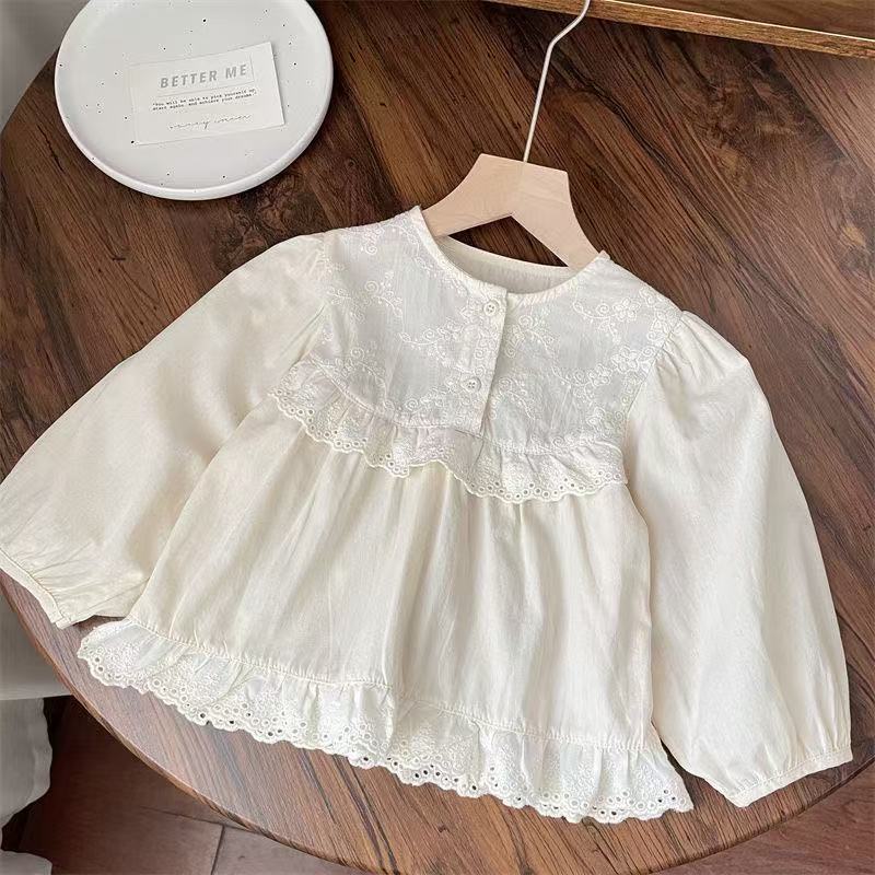 優宝2025新作子供服秋物子供用トップス可愛い女の子ベビーダールシャツ刺繍入り透かし彫り女児シャツ