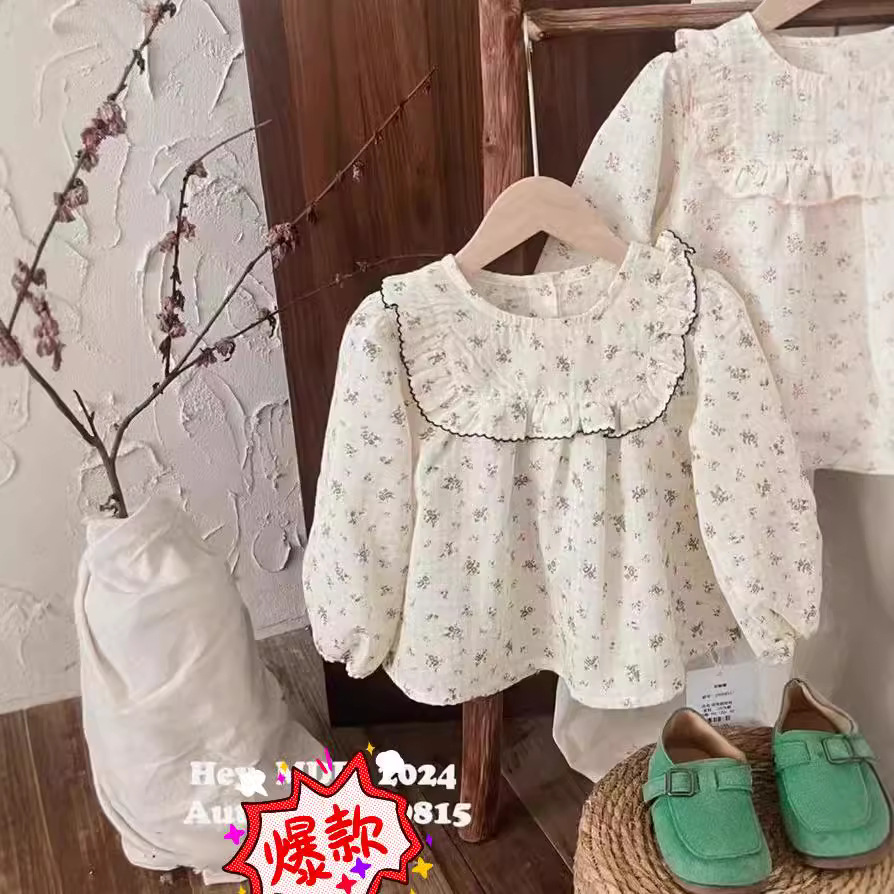 2025 新しい女の子のシャツ、ファッショナブルな牧歌的なスタイルの小さな女の子の純粋な綿の花柄の人形のシャツ、秋のシャツのトレンド