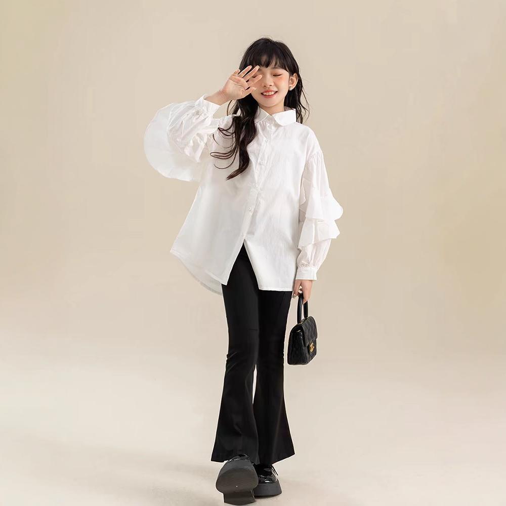 女の子の大きい子供の韓国版春秋のレースのシャツ2024の新型の韓国版の白い子供のシャツのハスの葉の縁の袖のシャツ