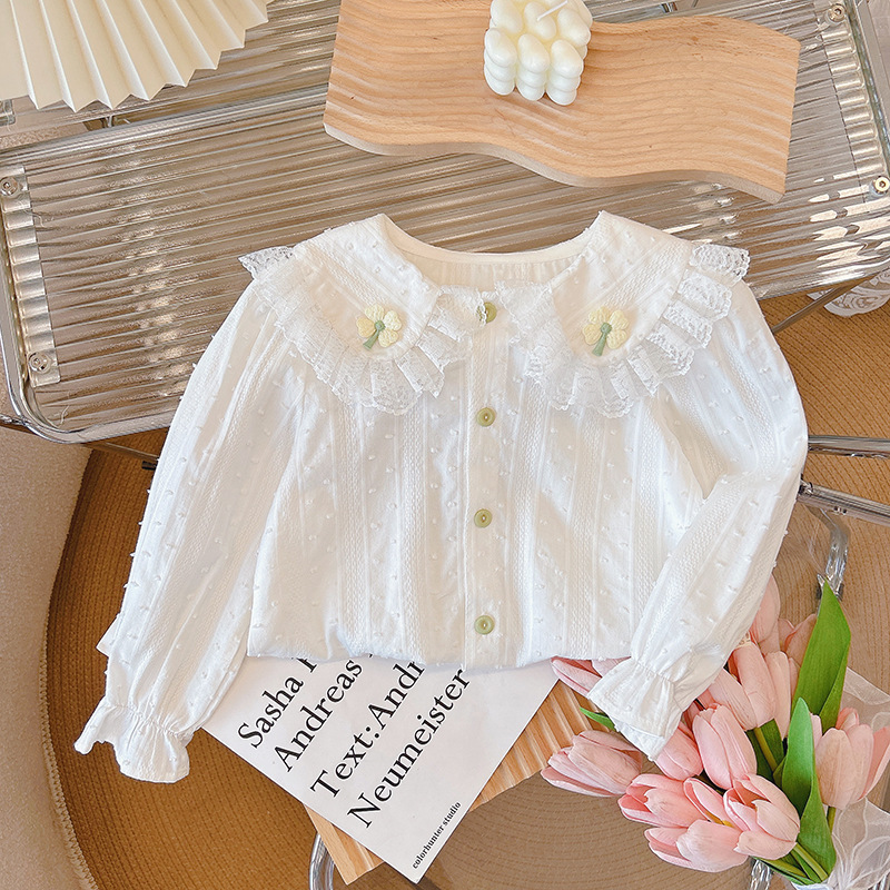 海外の女の子向け春秋新作シャツ、おしゃれな長袖白シャツ、子供用フリルレースドールカラーインナー