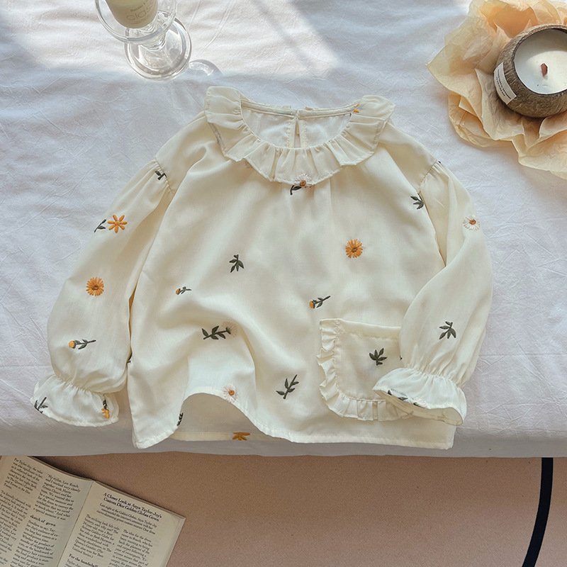 女の子の春と秋の新しい純綿刺繍女の子シャツシャツ長袖ベビードール襟ベビーシャツ女の子ラペル