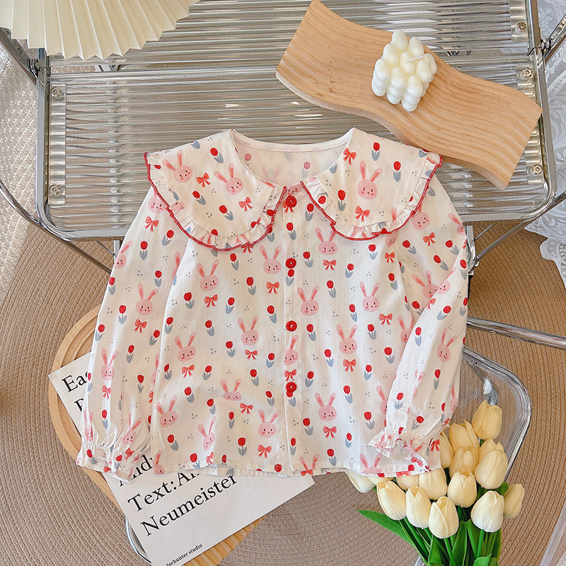2025 春の新作子供服女の子バニーシャツ子供白シャツ人形襟トップベビードールシャツ