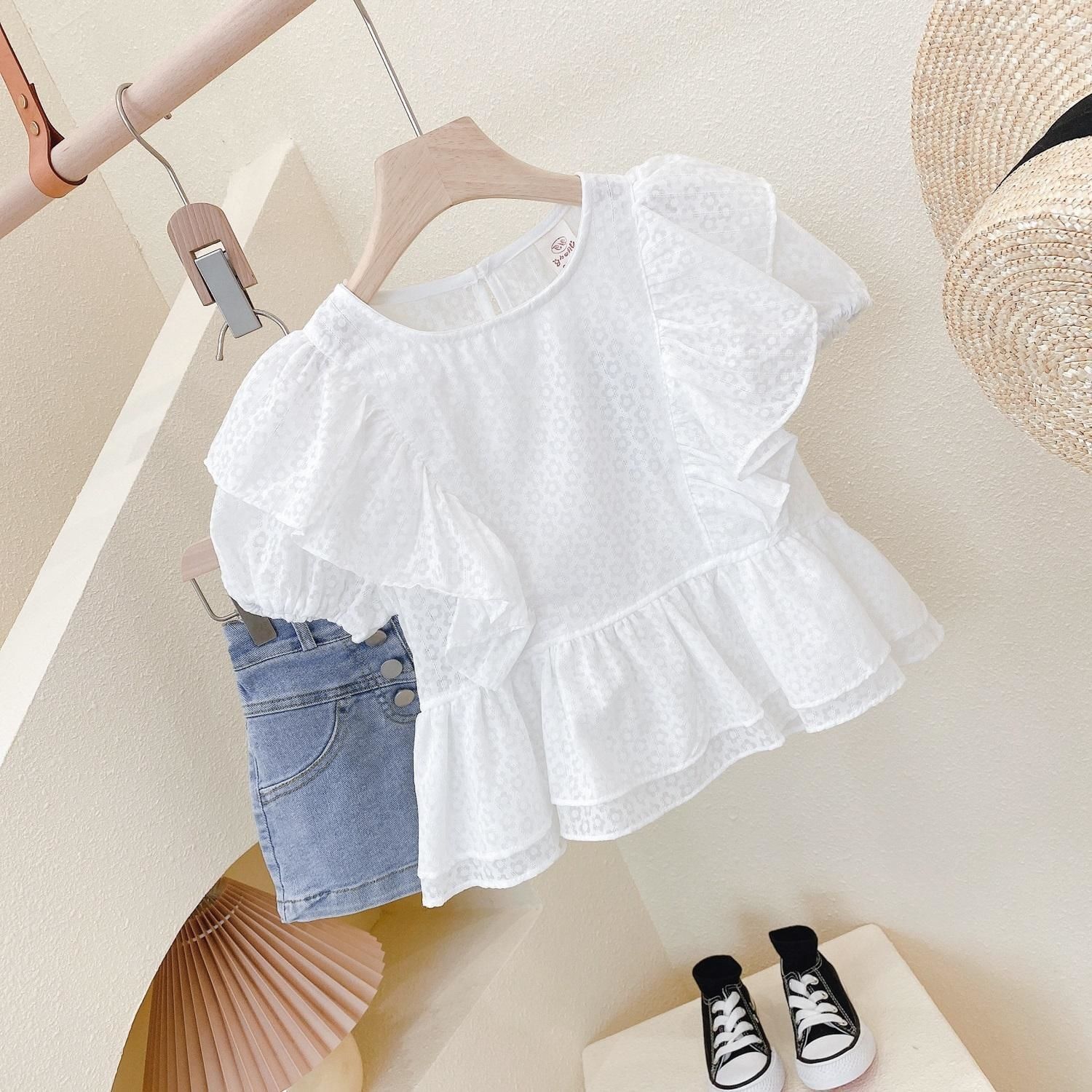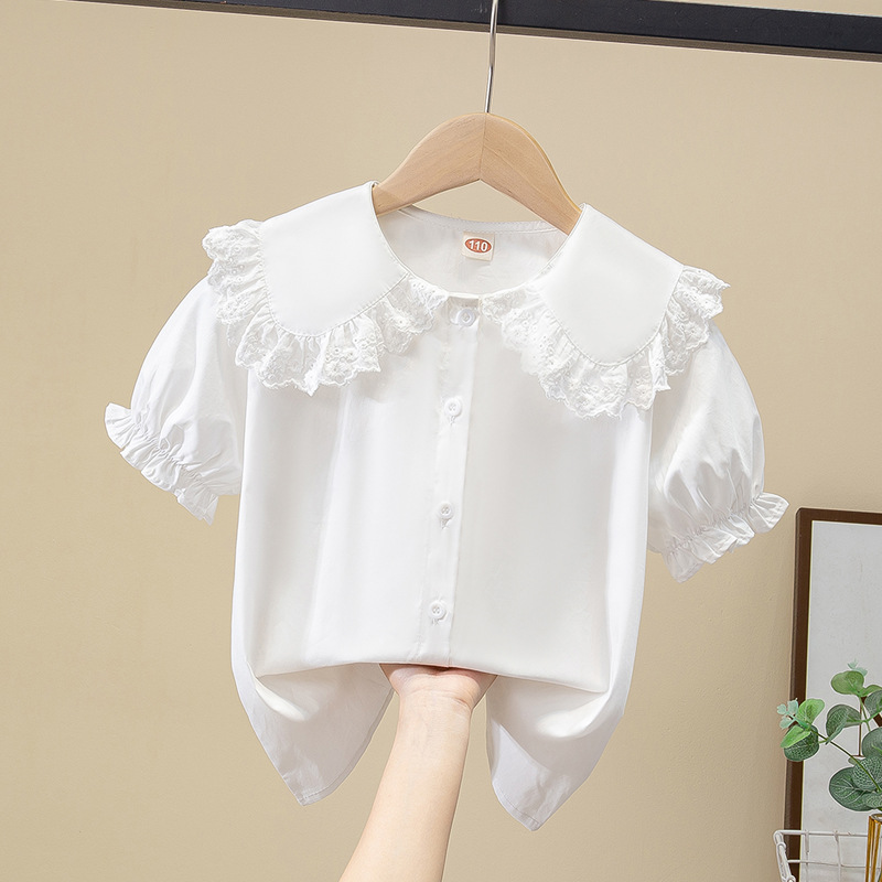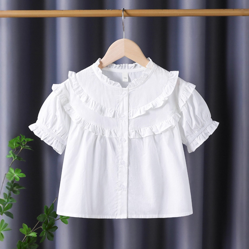 女の子白シャツパフスリーブシャツ2025新しい夏薄いスタイル半袖フリルファッションベビードールシャツ