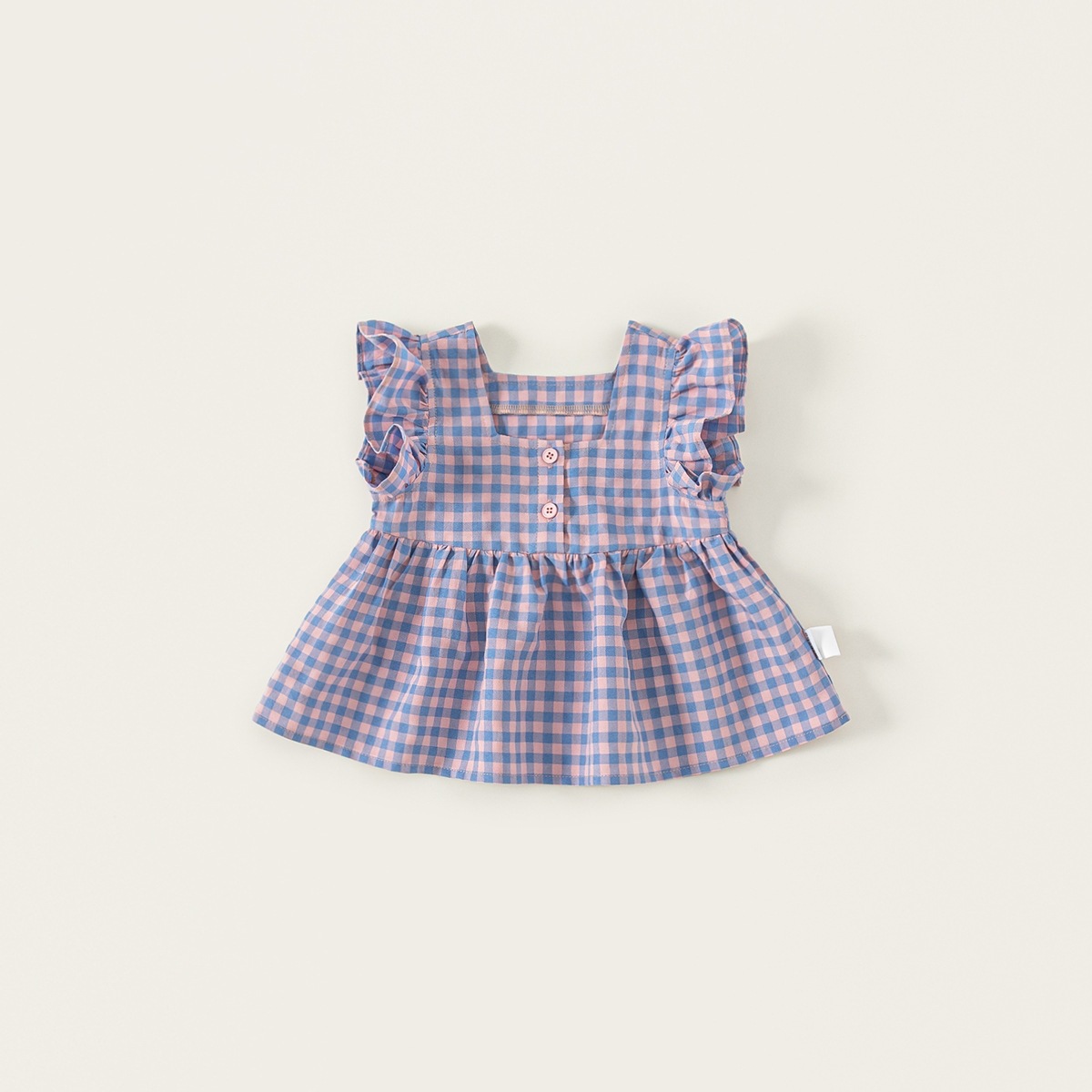 新しい子供服、甘い夏服、新しい子供用スクエアカラートップス、女の子用ピンクチェック柄ベビードールシャツ、小さなフライングスリーブシャツ