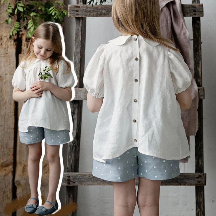 女の子服リネンドールカラーシャツフォレストスタイルかわいい半袖コットンとリネンのルーズトップ女の赤ちゃん夏カレッジスタイル
